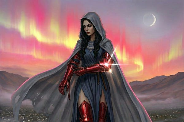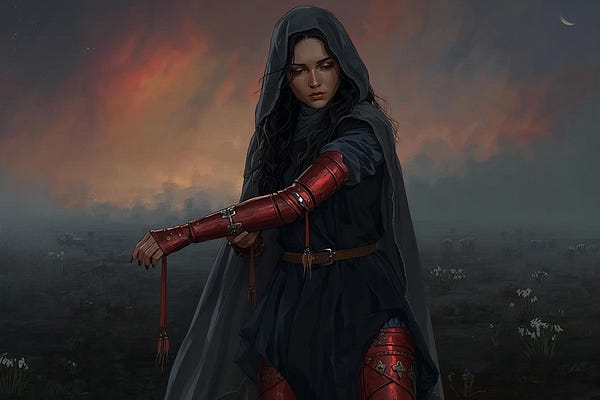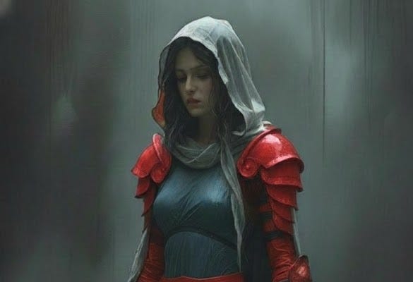 Uma súplica tecida entre o metal e o destino inevitável. A imagem de Perséfone paramentada, onde a armadura e o espírito se encontram em um momento de…