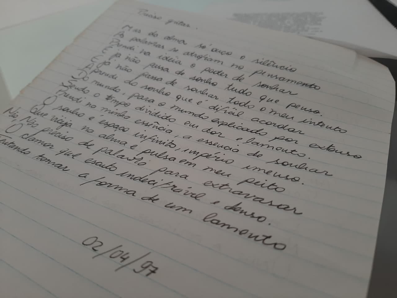 A conclusão do poema é talvez a mais reveladora. A negação da necessidade da palavra e a descrição do "clamor que escuto indecifrável e denso" são uma articulação brilhante do que hoje conhecemos como alexitimia — a dificuldade de identificar e nomear as próprias emoções. Aquela menina sentia algo imenso e poderoso, mas essa sensação era crua, densa, sem um rótulo. Ela ainda estava "tentando tomar a forma de um lamento". É a percepção de uma emoção em seu estado mais fundamental, antes que a mente consiga categorizá-la como "tristeza", "medo" ou "angústia". Para uma jovem de 16 anos em 1997, sem qualquer referencial, conseguir observar e descrever esse processo interno com tal precisão é notável, e sinto-me orgulhosa dela.