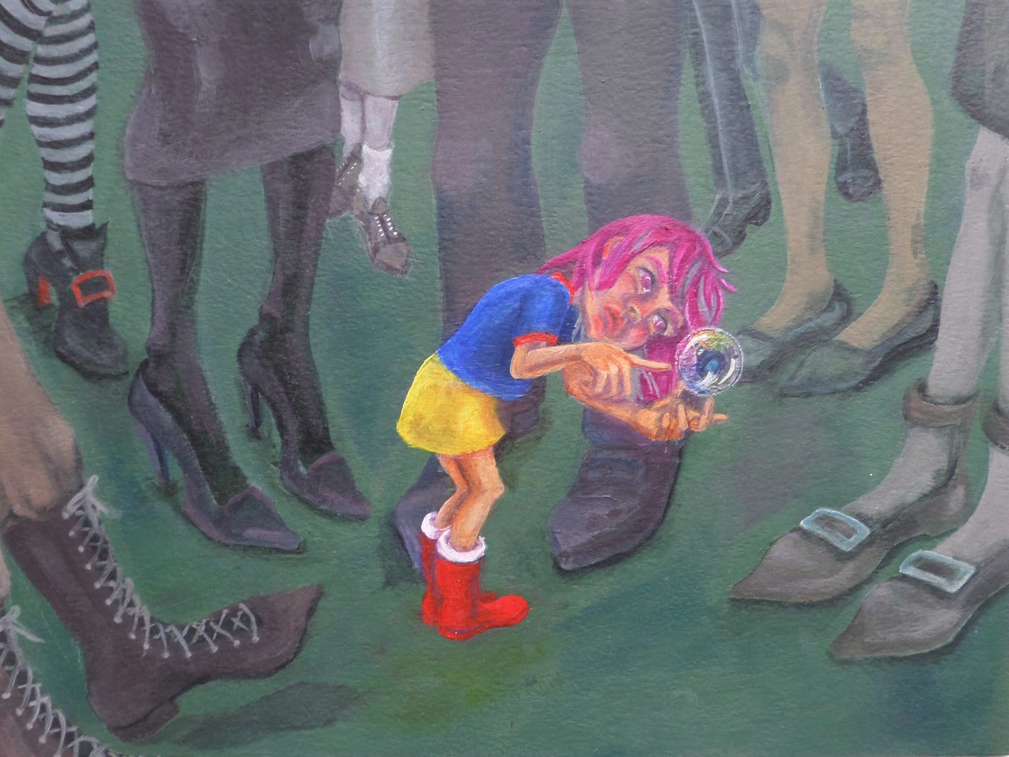 Mais uma ilustração praticamente finalizada. Esta foi refeita do zero pela mesma razão da número um: a idade da personagem, que foi modificada ao longo de seu desenvolvimento posterior (como roteiro cinematográfico). No caso desta, houve também uma razão técnica para a não alteração da ilustração anterior, que já havia sido retrabalhada em termos de forma e cores: a tinta usada. Ela foi finalizada com tinta a óleo e não posso sobrepor tinta acrílica sobre óleo.