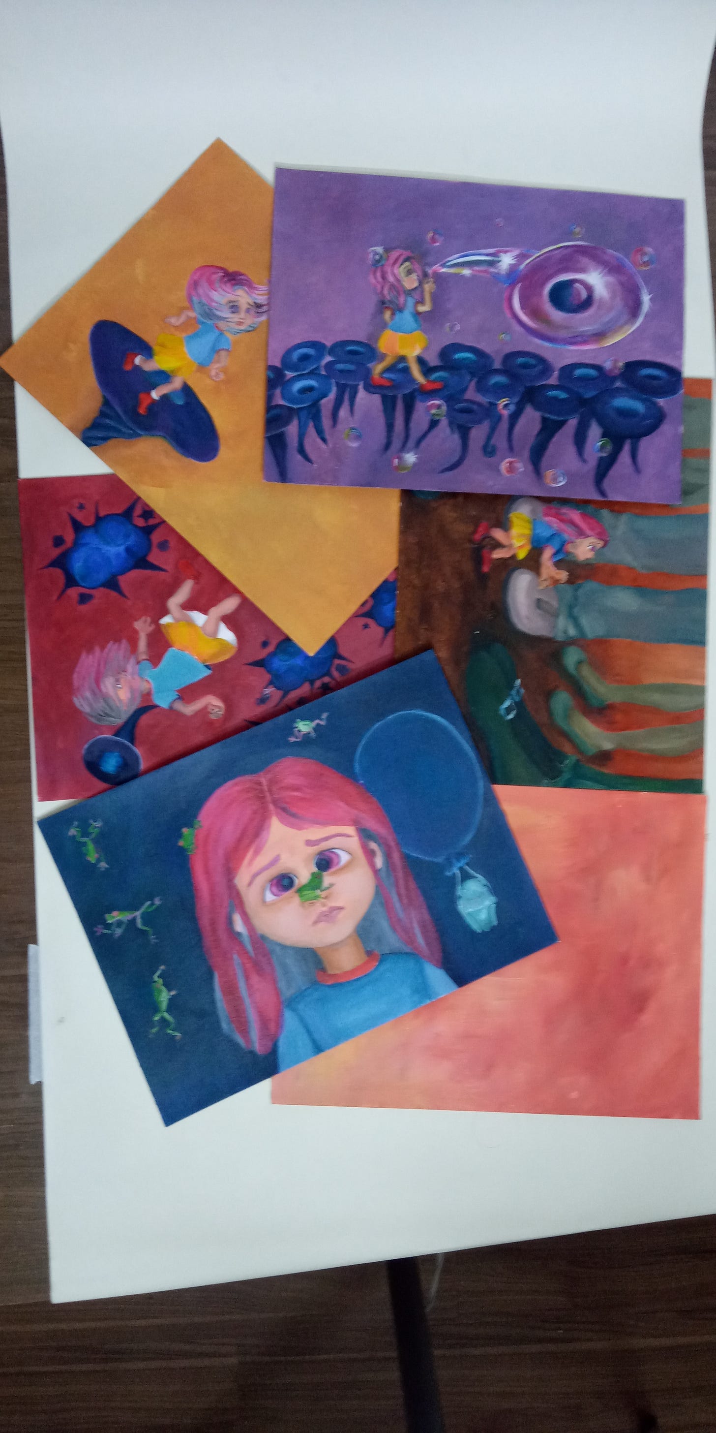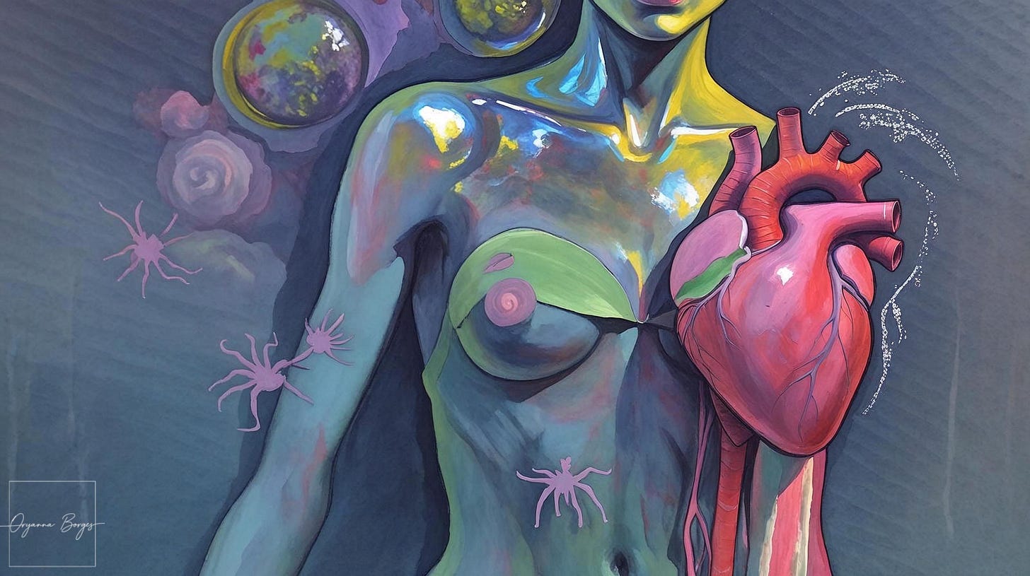 The accompanying image is a visual echo of this intricate journey, presenting the body as both a battlefield and a miracle. The heart, central and exposed, pulsates with an energy that defies morbidity. And here lies a surprising contrast: despite the rawness and intensity of the poem that led to the prompt for a digital illustration, the vibrant and exuberant color palette in the artwork originates from a previous work for a children’s story. This unexpected fusion of colors injects a magical glow and a subversive delicacy into the surrealism and expressionism of the image, transforming the struggle into a visually rich celebration.