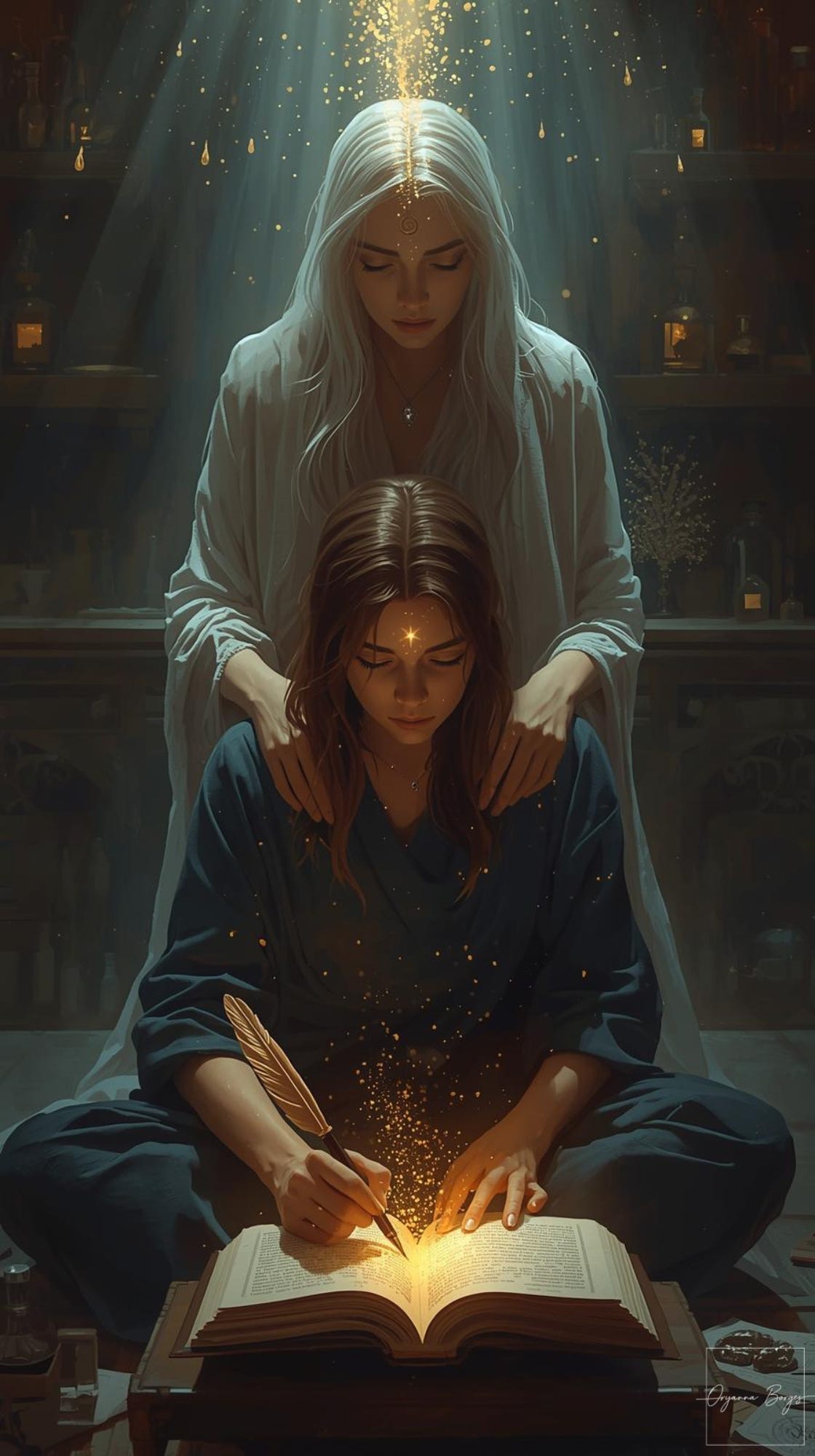 Em um abraço de luz e inspiração ancestral, o silêncio da alma encontra a melodia da musa. Uma jornada poética onde a vulnerabilidade se transforma em arte, guiada pela sabedoria etérea.
