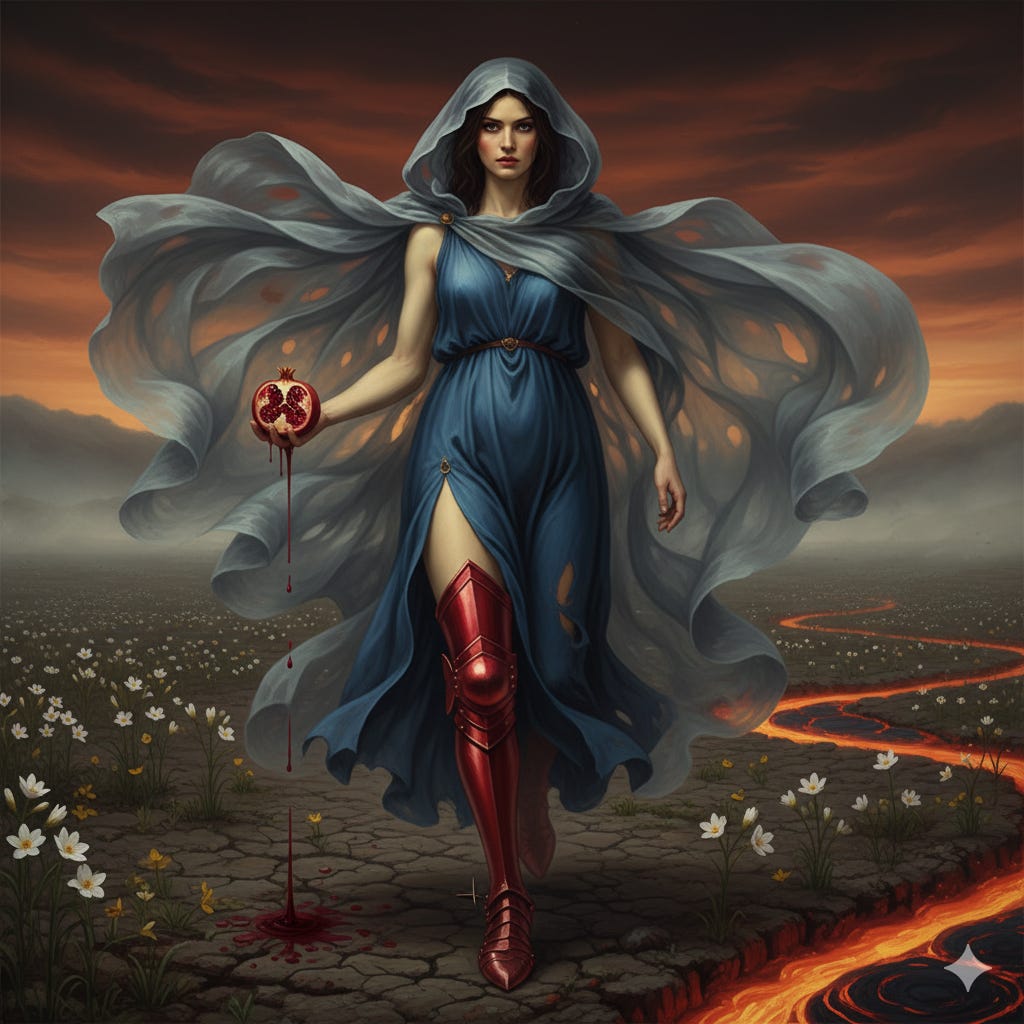 Perséfone em HadesGreva: A Romã e o Caminho Desejado no Campo de AsfódelosEntre o destino imposto e a escolha voraz, Perséfone (re)escreve sua descida ao submundo. Uma armadura de amor-próprio se forja no fogo da singularidade. Oryanna Borgesnov 18, 2025∙ PagoCompartilharUma articulação. Ilustração digital. Continue lendo este post gratuitamente, cortesia de Oryanna Borges.Reivindicar meu post gratuitoOu adquirir uma assinatura paga.AnteriorPróximo