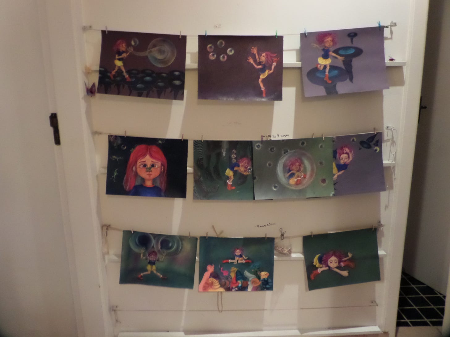 A ilustração evoluiu pouco nestes últimos dias, tão sobrecarregados de assuntos diversos. Uso o mural do prévio dono do quarto que ocupo para me localizar e estimular, mas o esboço da ilustração seguinte jaz em minha prancheta. Não lembro quando toquei na pintura pela última vez, mas sei que demorei dias para readequar a ideia original ao conceito que está se refinando, ilustração a ilustração.