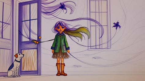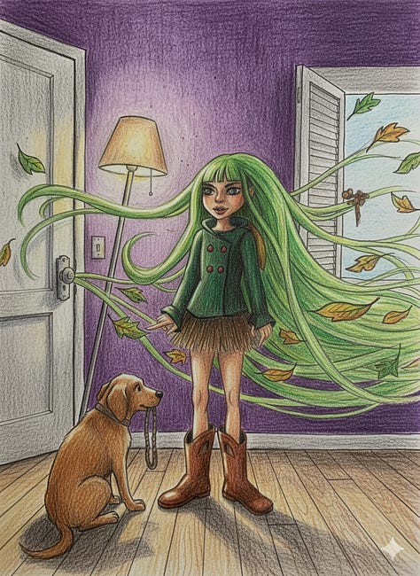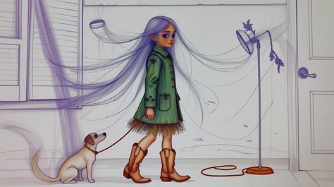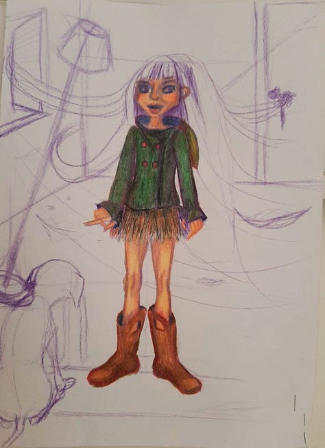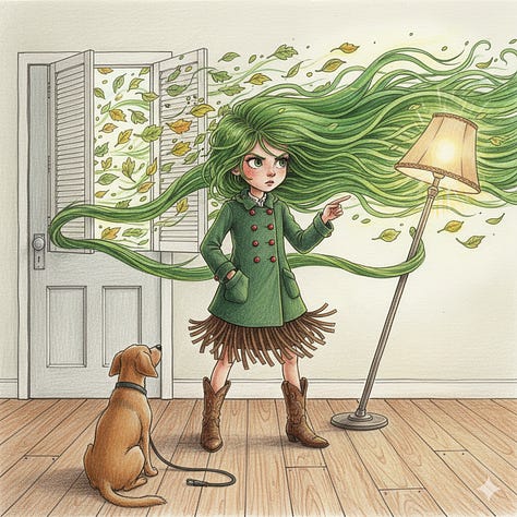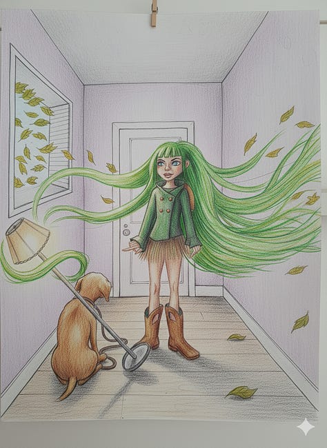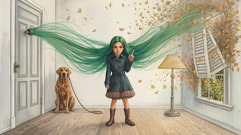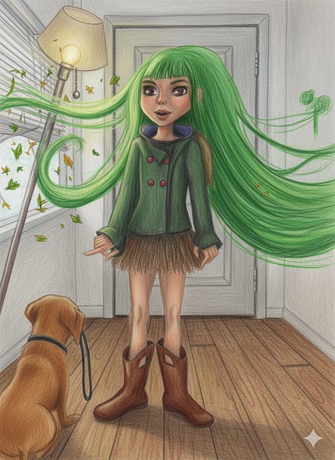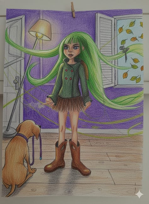 Nesse percurso desafiador, mas recompensador, a criatividade não se restringe apenas ao meu trabalho acadêmico. Se por um lado, faço isso no TCC; por outro, na investigação minuciosa de meus escritos da fase da adolescência, postados duas vezes por semana na seção Poesia para Ler. A criatividade pulsa, portanto, em cada momento, mesmo nos intervalos, nas pausas e nas explorações pessoais que alimentam a alma do artista. É nesse contexto que apresento a vocês a Menina Verde, uma figura que nasceu de exercícios de aula no projeto Máscaras Criativas e cujo esboço de cenário me trouxe o desejo de explorar um pouco mais a criação interativa com a IA. As imagens que agora compartilho ganharam vida através de um exercício fascinante de colaboração e inovação.