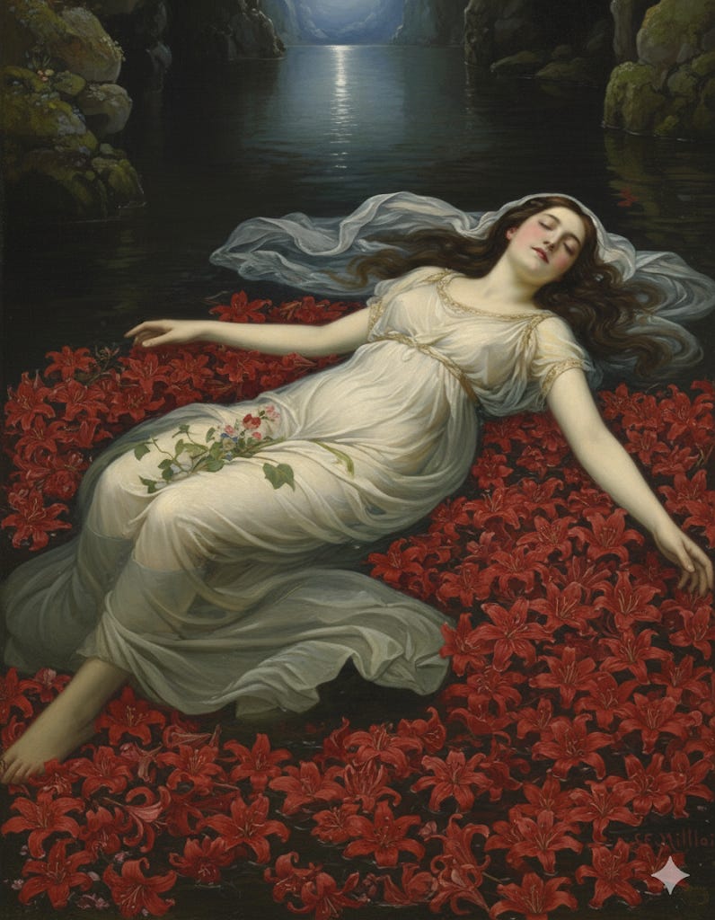 Imagem criada por IA, inspirada no poema e na iconografia da Ofélia, de Shakespeare