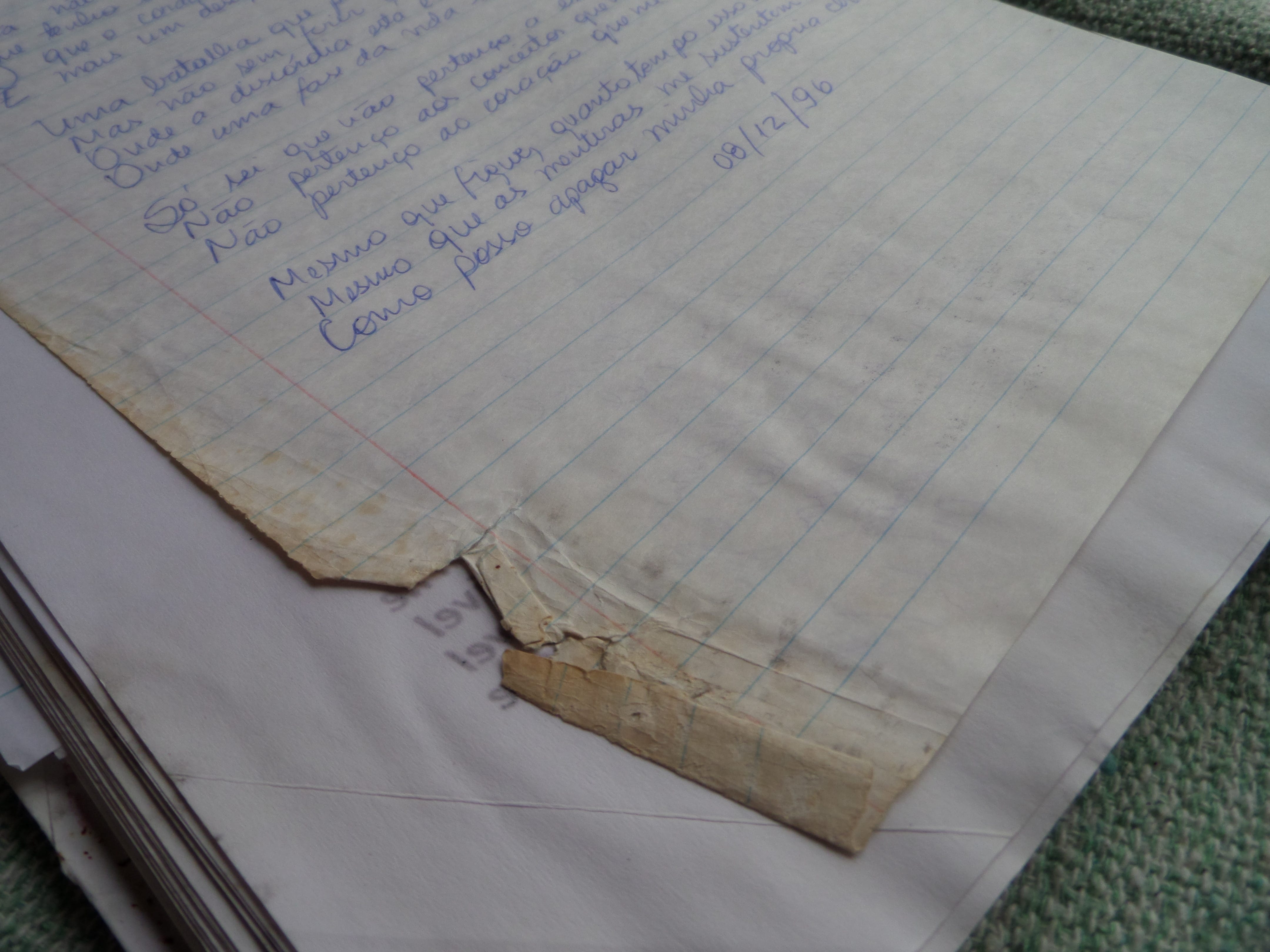 O papel mimetiza as marcas da ruminação, macerado pelo tempo, e seu verso tem um extenso poema — este sim, selecionado para compor a obra visualizada —, composto em 1º de dezembro de 1996.