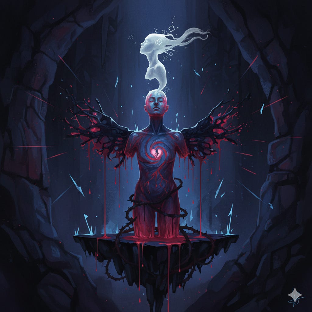 Nesse estado, a dissociação empoderadora, que integra a Sombra, talvez não seja possível. Pode haver um “congestionamento” neuronal que impede o acesso a uma consciência mais ampla, forçando o ser a permanecer nos voos rasos da razão. A dissociação em “Sangria” é, portanto, uma fratura de emergência. A alma, o centro criativo e emocional, fica paralisada. A mente, o intelecto que mapeia o território inóspito, escapa para o abstrato como única forma de sobreviver.